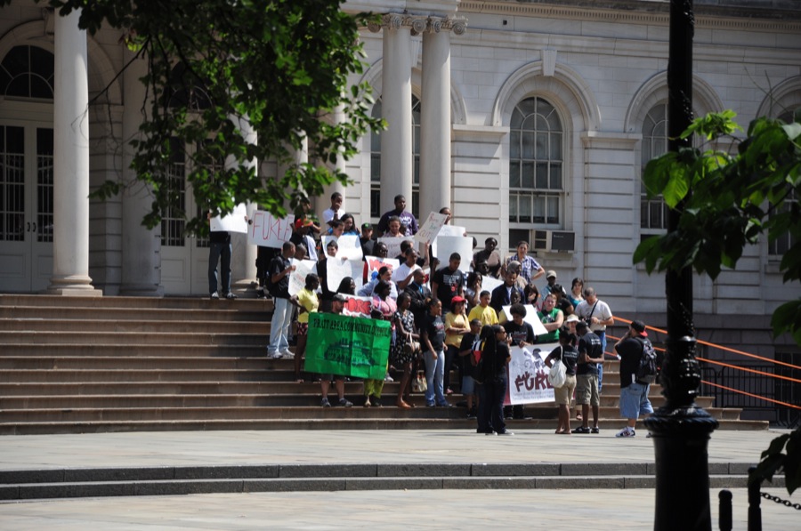 Ich werfe ein blick auf die Baustelle vom WTC und gehe weiter zur City Hall, dem Ratshaus wo gerade eine wohlorganisierte Kundgebung einer Protestgruppe stattfindet. Wofür kann ich nicht eruieren, das Gelände ist abgesperrt für „autorized personal only“.